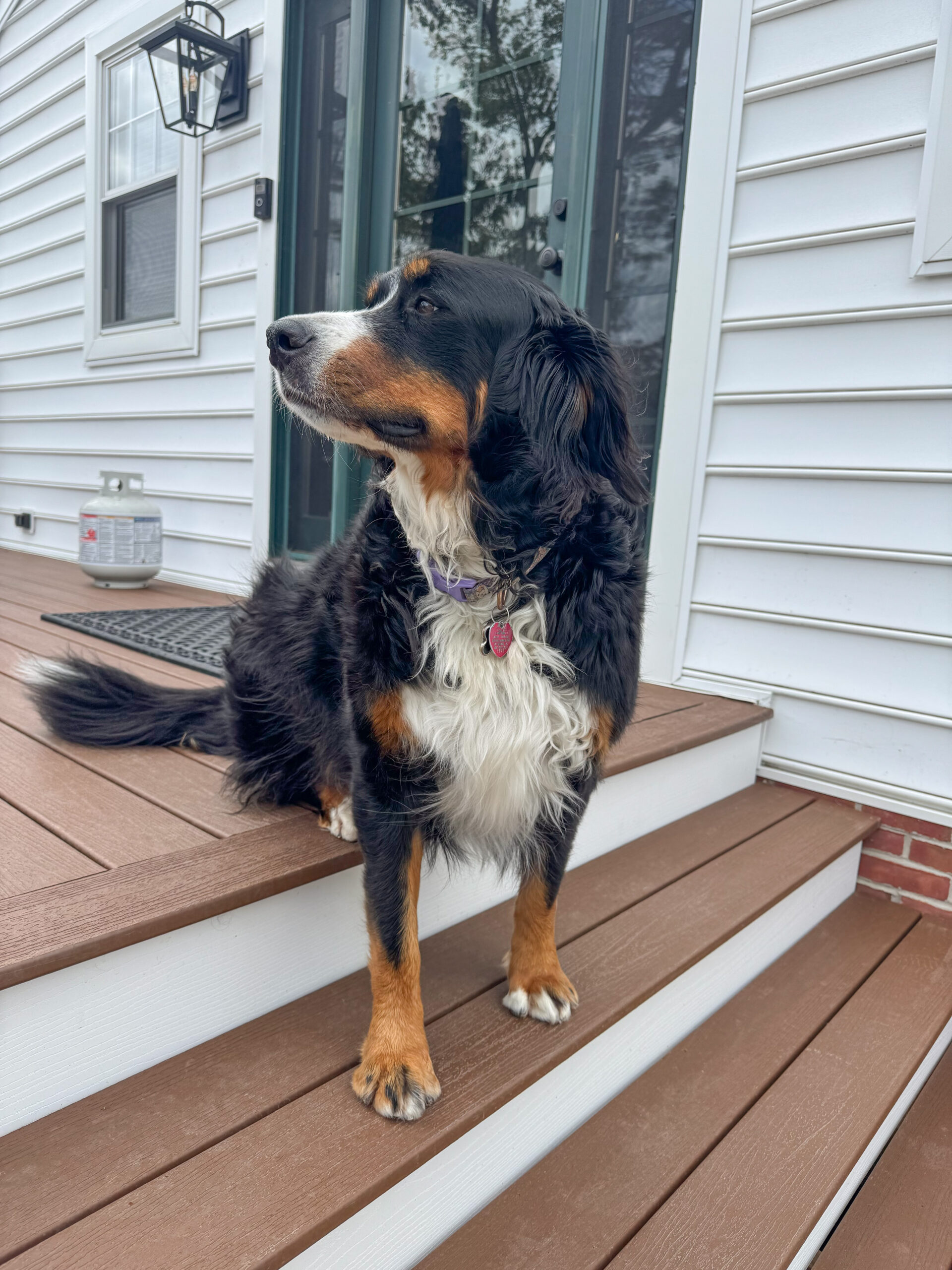– It became apparent to us shortly after adopting her in 2019 that she had a real fear/anxiety problem. We took her to a behaviorist who diagnosed her with “World Fear”, which is common in Berners and basically means she’s prone to fear. We do have prescription medicine to treat this (BusPirone and Gabapentin) that we give her twice daily.
